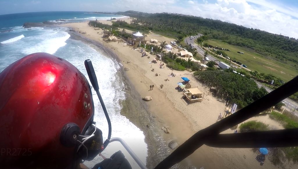 The “Corona Pro Surf Circuit” Event in “Middles” Beach of Isabela is ON…, a competition of the best exponents of the sport making a stop on the island. We have had the opportunity to fly it in previous years and this year was no exception. This time we went to “Posa of Teodoro” located next to “Middles” Beach, place of the Event. Luis Ruiz was accompanied by the pilot Berto Garcia, and moments later appeared for enjoy a trip in paramotor Luzmar Soneira and Brittany, who reside in San Germán. They knew about our intentions and communicate with us to plan the adventure.