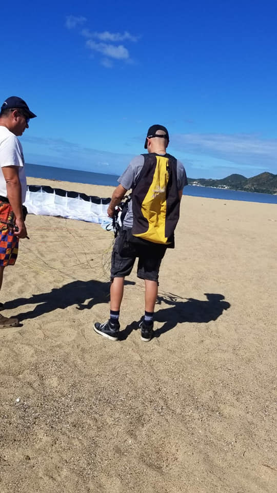 The weekend started with the arrival of the Kamikaze pilot, Esteban Torres. He traveled from New York, expressly to fly paramotor with the Team Kamikazes on the island. He came accompanied by his partner María Isabel. The first thing in the morning was meet with the Instructor Luis Ruiz at hos home. Luis gave Esteban his new flight equipment. Esteban was step by step buying it though past months, and finally everything was set waiting for his arrival.