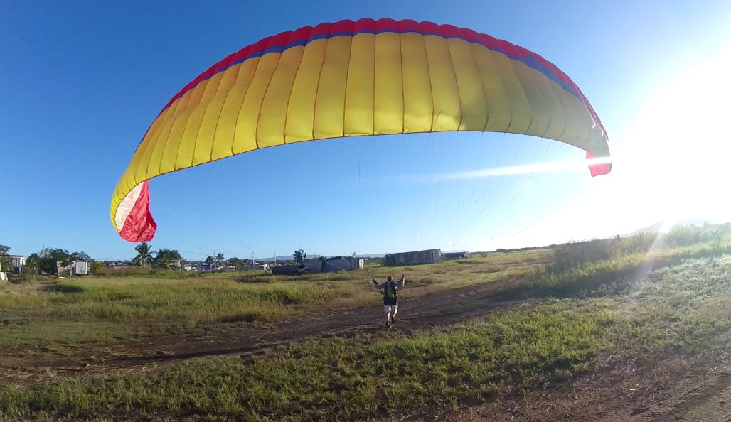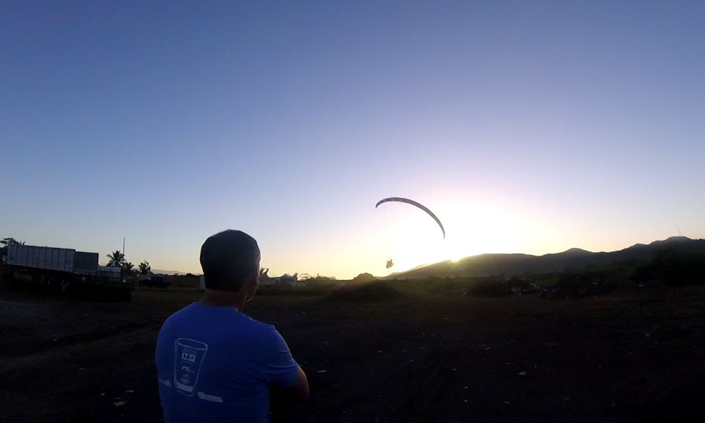 Evan prepared his equipment and this time he took to flying, the paraglider BGD Luna of Luis. Luis decided not to fly to dedicate himself to Patrick’s lessons. As we mentioned before, he turned out to have good ability and after some attempts he already successfully made several front launches with the paraglider. Evan flew around the area that included the town of Boquerón, the Beach, and up to the Sierra Bermeja where he got some turbulence on the other side of the mountain. We was very pleased with Luis paraglider. At around 9:30 AM the wind began to rise in intensity and we took advantage of it to practice the reverse inflation of Patrick.