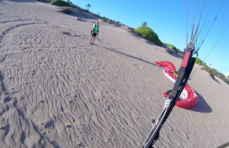 While this was happening, Luis took a flight around and at the same time discovered that at the moment it was not good for Patrick to go flying. So, we focused on his practices. Even the paraglider of Patrick’s practice was changed, from an Apco Thrust to the BGD Luna of Luis. So, he could check the different behaviors of the paragliders depending on the model and size.