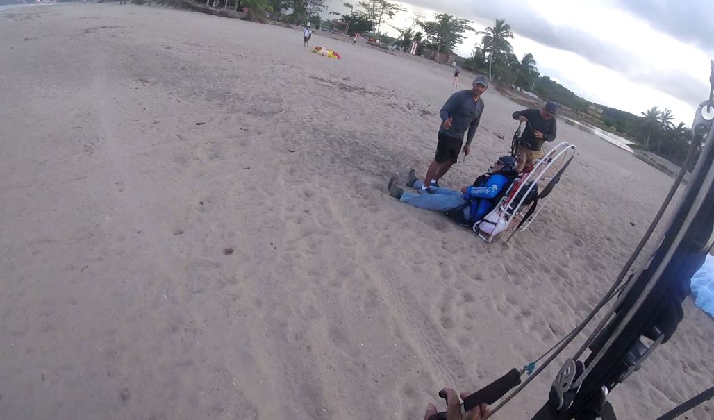 Later in the afternoon, the weather was composed again, and all the pilots returned to the air. This included Roberto on his second flight !!!. Again he make an excellent take-off and eventually landing. It last another half hour in the air. While this was happening on air, Jorge on ground was practicing the control of the paraglider. He started to look ready for his first “solo” fly.