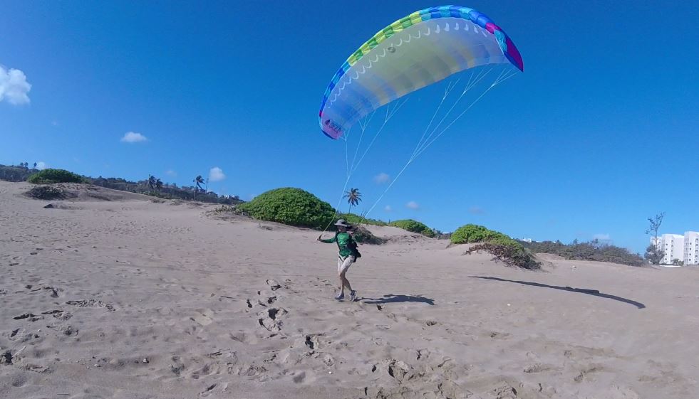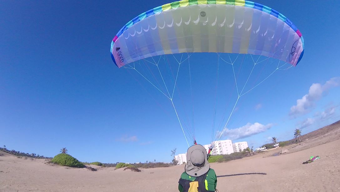 This time we took the opportunity to test the new small paraglider, BGD Seed of 14 meters. It looks and feel great in strong wind conditions. Both Thaddeus and Luis were testing it in conditions of winds higher than 20 mph. Also Thaddeus had the opportunity to test some paramotors in his back to feel the pressure from it.