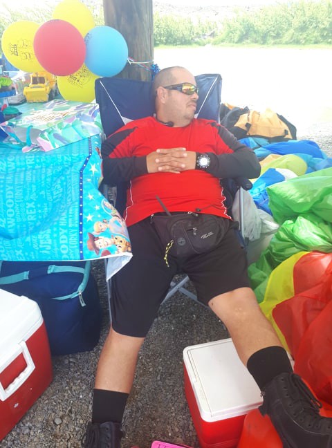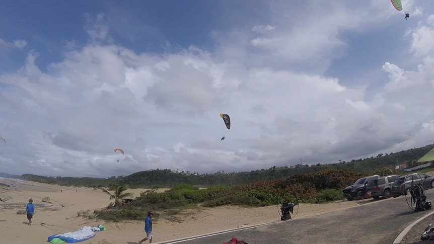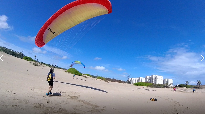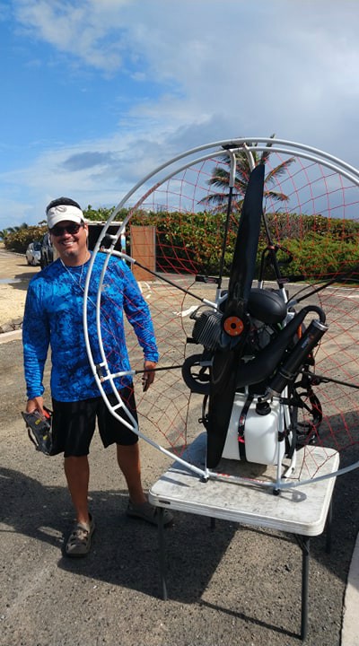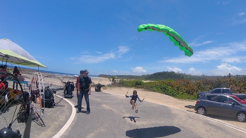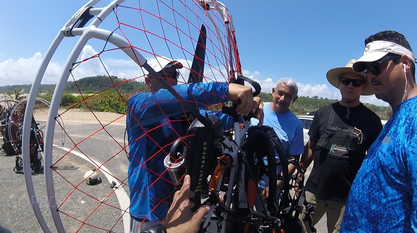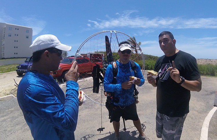 Luis finished setting up the tents and dedicated to assist in the practices of Javier and Randy. Both arrived early in the morning. Speaking about Randy, he received today, his new Fly Products Rider Moster paramotor. He started today the “Break In” procedure with the help of Chey and Gregory. He is ready for bigger challenges, but today we did not have a paraglider that suite him to fly in strong winds conditions. Instead, Pablo managed to give him a short flight by the “Towing” method. In other hand, Willian arrived from Manatí with his son Daniel to share with us and possibly begin course for the next weekend.
