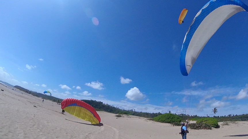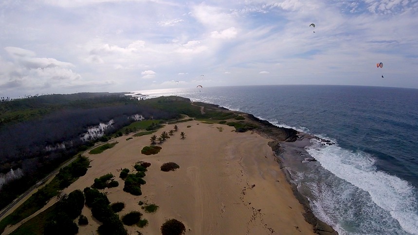 Luis was the only one flying in those conditions taking advantage of his sporty paraglider Apco NRG PRO of 18.5 meters. At about 4 PM the wind gets down a bit (at about 15 mph with some gusts of 20 mph). So, its time to fly again. This time, Chey, Gregory, Omar, Eduardo, Michael and Luis were all flying together all the way to Jobos Beach and the surrounding areas. Gregory, as usual made some acrobatics in the route. Every pilot looks great. They are truly ambassador of the sport, as people comes to us looking to learn the sport.