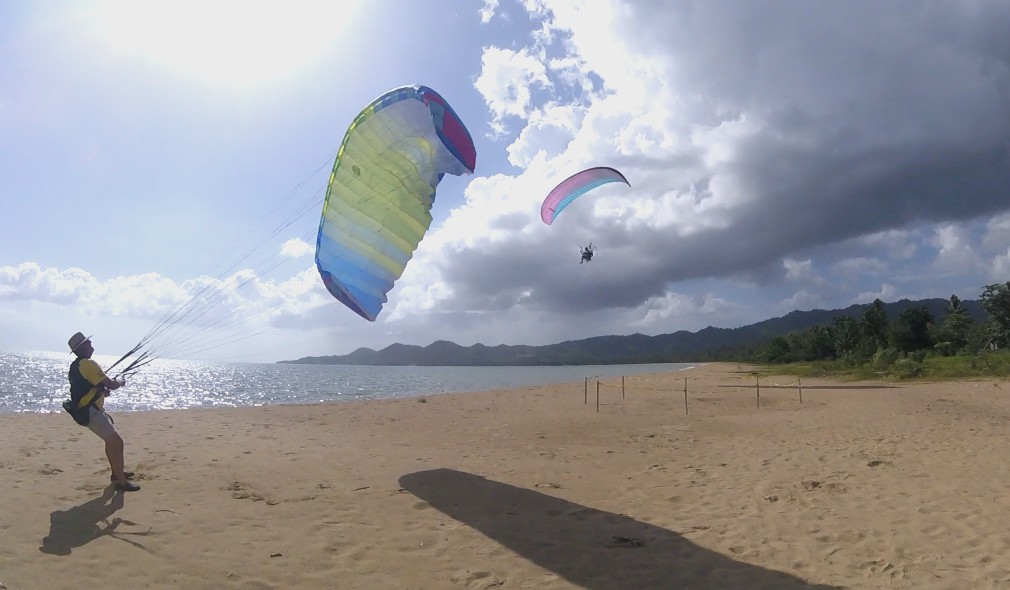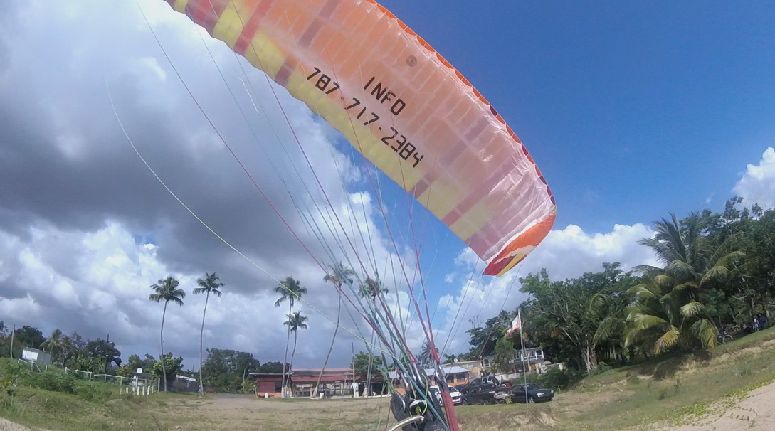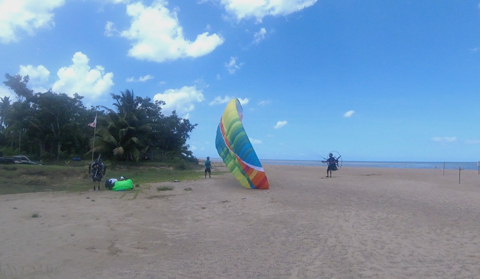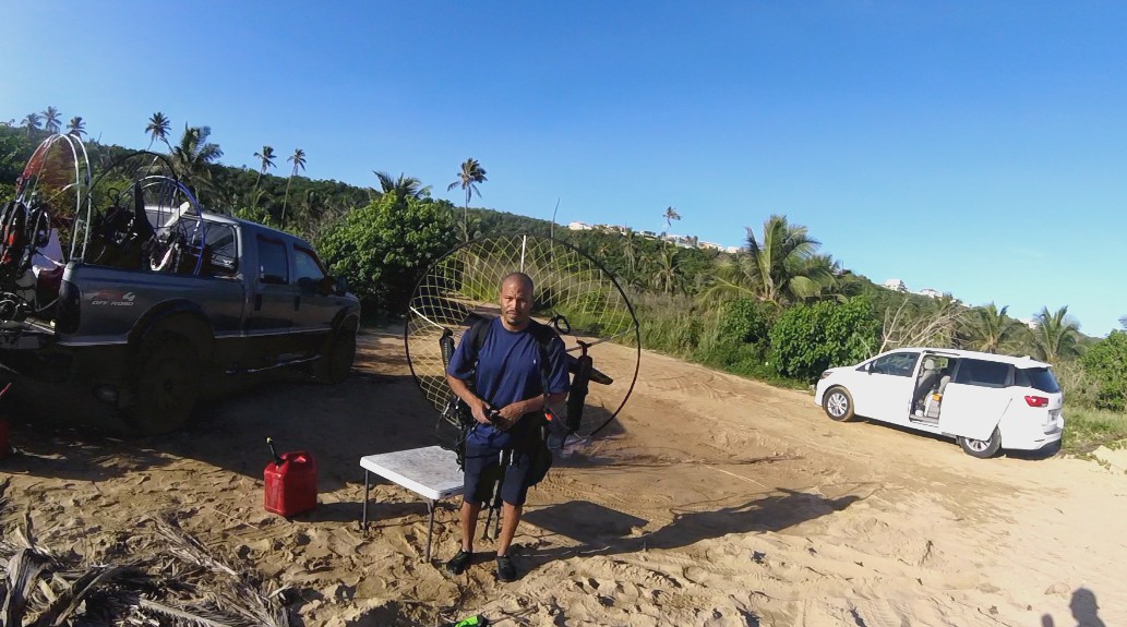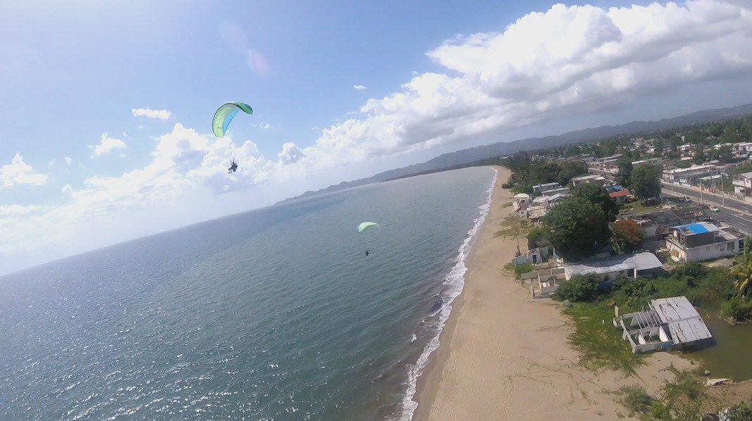 When we got to Isabela, the winds were good, and we calculated that we would have a flight window of an hour and a half before it got windy. Things were not so easy. The paramotor of Deron that was mounted p last night was giving some adjustment problems. So, Luis gave his personal paramotor to Deron so he could take a flight around. And while Deron was flying, Luis was adjusting Deron’s paramotor. He managed to fly the entire area between Villa Pesquera to Jobos Beach, and it was very good for him to get to know better his new paraglider BGD Luna 2.