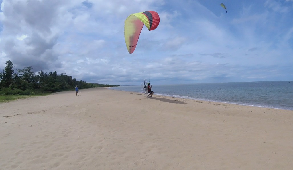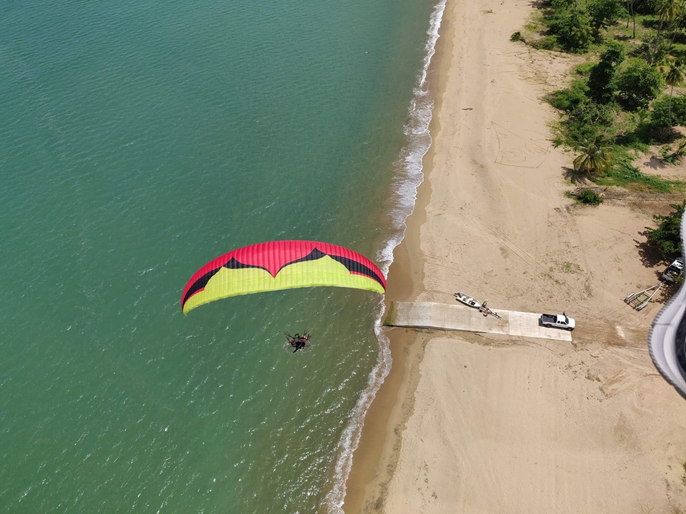 The first to go flying was Ernie. He did a very well launch. Then, the turn was for London. But we need to mention that it gets kind of complicate in the beginning. London fly in Florida with left hand accelerator on his equipment and here the paramotors have installed the accelerator on the right side. Apart from this, we discovered that London had not been flying for a few years by the “Foot Launch” method 😲 and that he only flew in “Trike” due to back problems. This would be his first flight attempt in “Foot Launch” with opposite throttle and a very short track, before reaching the ocean🙄.