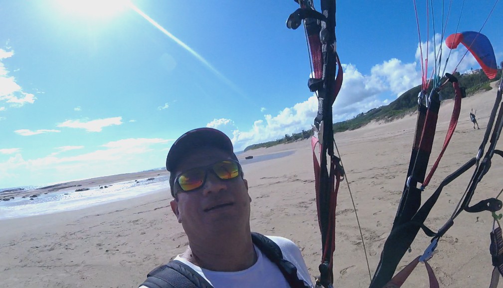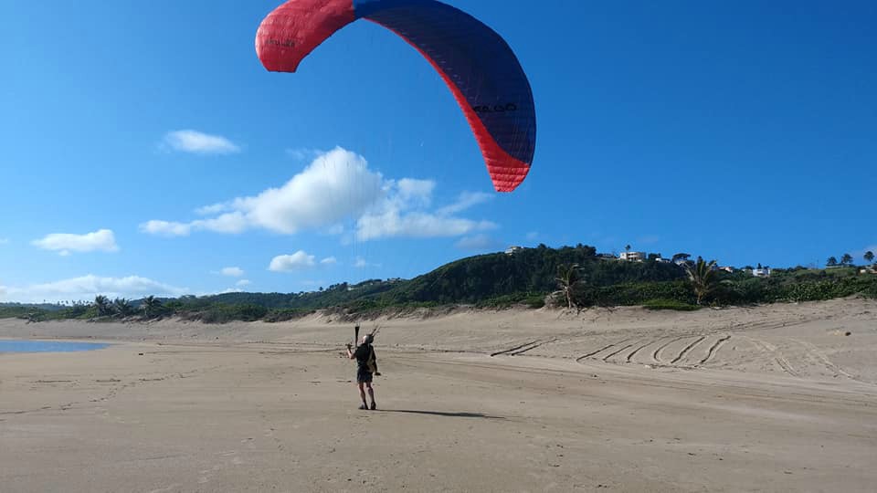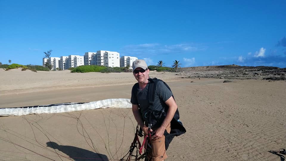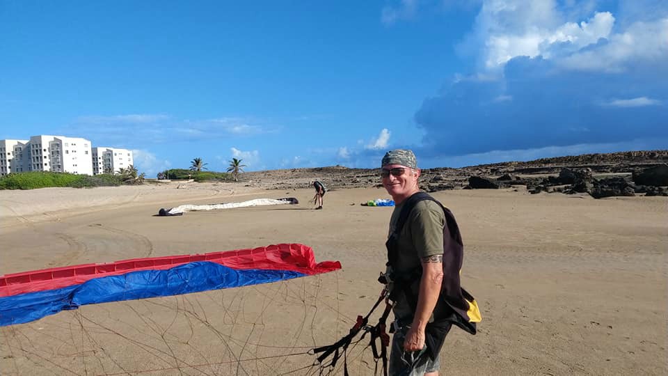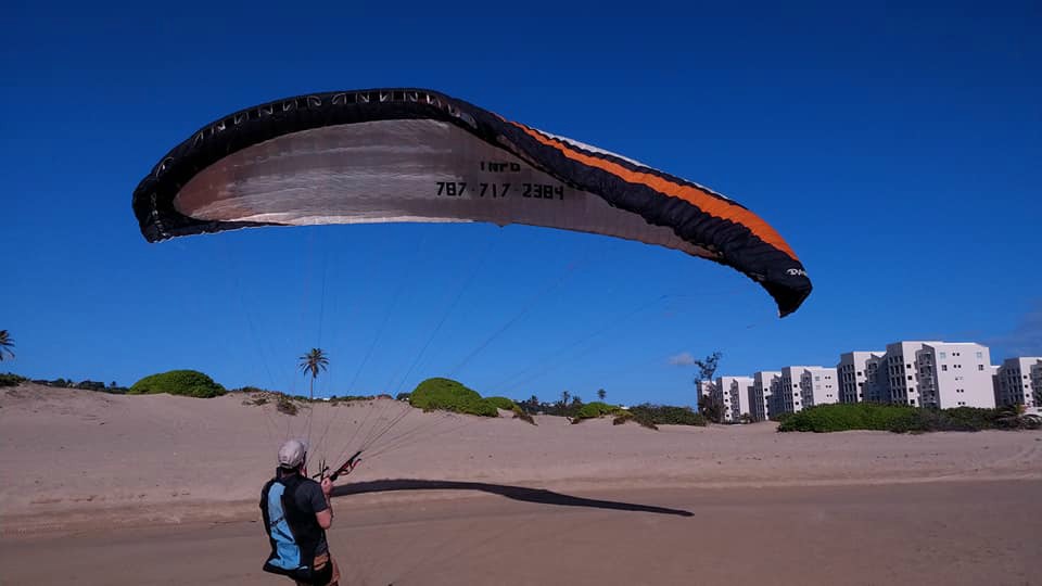 The Instructor Luis Ruiz cited students Ewell Young and William Nadal (accompanied by his wife Maribel) at 7 AM at Villa Pesquera in Isabela. They will train as predicted until 10 AM. The wind started smooth and Luis was testing equipment, even flying a little. Ewell arrived at 7:20 AM and from there he began to practice inflated with an Apco Thrust paraglider, while William arrived at 7:40 AM and practiced with an old and reliable paraglider Paramania GT.