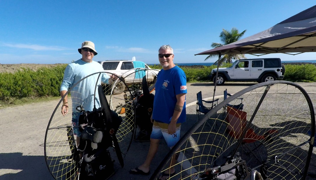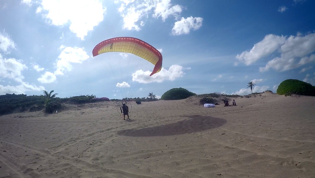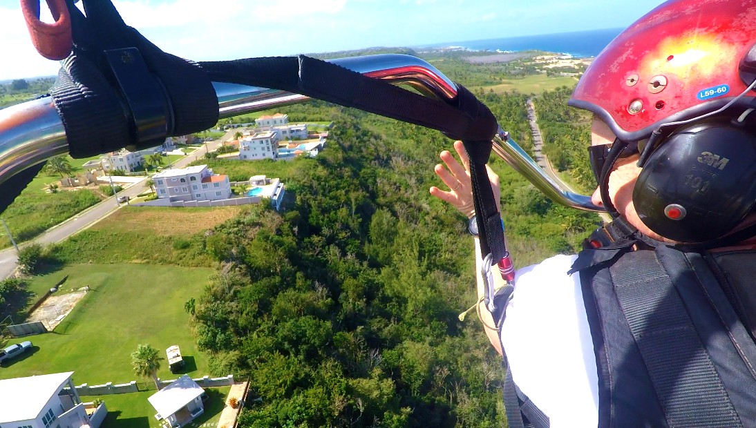 After some minutes, Luis coordinated that Eric (with Fly Products Atom80 and Ozone Spyder 3 paraglider), and TNT (SkyMax EOS100 and Apco Thrust paraglider) went flying. This is just the second fly of his career for TNT and he was enjoying it to the fullest. On Eric’s part, imagine… in Washington the temperature is around 30F, and here he was flying in excellent weather and at 80F. After their launch, Luis also went flying. This time taking Sandrine for a Tandem fly. She had previous Tandem Free Flight experience and here she was amazed at how smooth the paramotor flight was.