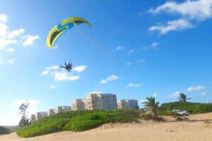 He pulled out his Ozone paraglider, but Luis Ruiz suggested he use the faster Sky Z Blade instead. After evaluating the conditions, Edgardo decided to go for it. Below is a short video of the attempt. He was definitely flying at the limit (winds at 25 mph with gusts surpassing 30 mph+).